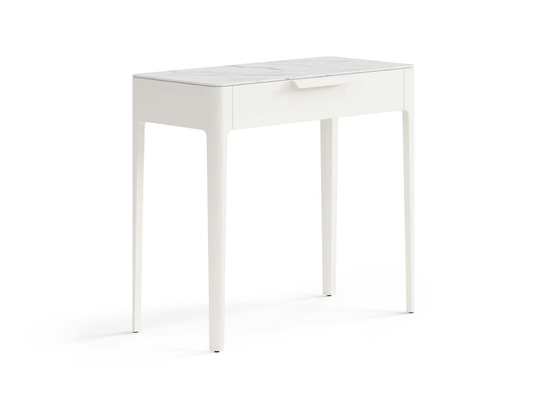 Консоль с двумя выдвижными ящиками на высоких элегантных опорах идеально впишется в любое помещение вашего дома и сделает его особенным. Изысканно сглаженные формы подчёркивают теплоту дерева, наполняют пространство природной гармонией. Скрытые направляющие ящиков с доводчиками и ручки в форме крыла делают пользование консолью мягким, уверенным и максимально комфортным. Столешница выполнена из керамогранита, крепкая поверхность приятна на вид и на ощупь. Ваза с букетом свежих цветов, любимые сборники литературы и тёплый торшер на консоли создадут истинный уют.