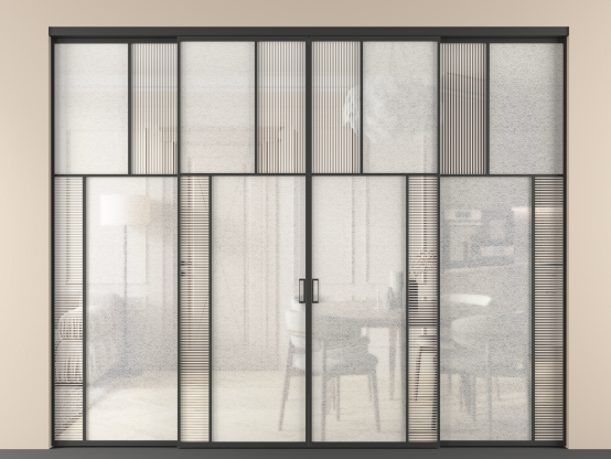 Во всех алюминиевых перегородках, независимо от типа установки, используется компланарный раздвижной механизм, благодаря которому декоративная крышка и полотно находятся в одной плоскости.
