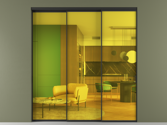 Мы предлагаем девять вариантов декоративного стекла: от кристально-прозрачного до матовых цветных, а также стёкла с эффектом Stopsol, когда лицевая сторона стекла зеркальная, но при включенном освещении за стеклом — становится прозрачной.