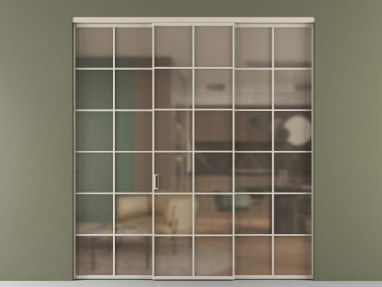 Дополнительно на раздвижную двустворчатую перегородку вдоль стены и четырёхстворчатую перегородку внутри проёма с двумя неподвижным полотнами можно установить механизм синхронного открывания — при открывании одной створки, вторая открывается автоматически.