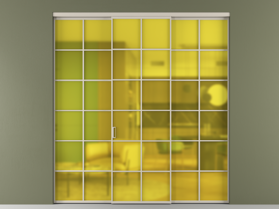 Дополнительно на раздвижную двустворчатую перегородку вдоль стены и четырёхстворчатую перегородку внутри проёма с двумя неподвижным полотнами можно установить механизм синхронного открывания — при открывании одной створки, вторая открывается автоматически.