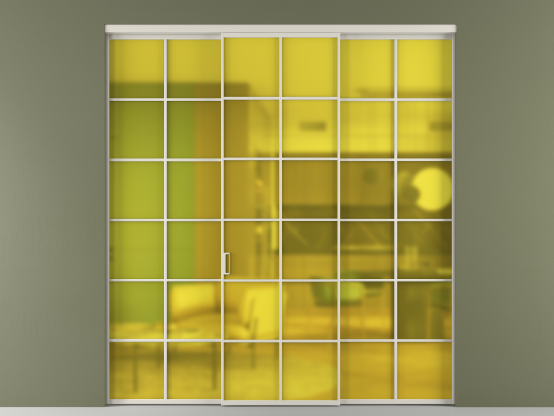 Дополнительно на раздвижную двустворчатую перегородку вдоль стены и четырёхстворчатую перегородку внутри проёма с двумя неподвижным полотнами можно установить механизм синхронного открывания — при открывании одной створки, вторая открывается автоматически.
