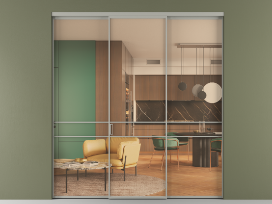 Во всех алюминиевых перегородках, независимо от типа установки, используется компланарный раздвижной механизм, благодаря которому декоративная крышка и полотно находятся в одной плоскости.