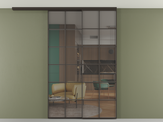 Во всех алюминиевых перегородках, независимо от типа установки, используется компланарный раздвижной механизм, благодаря которому декоративная крышка и полотно находятся в одной плоскости.