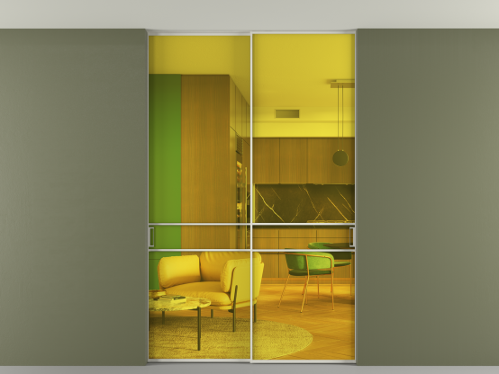 Мы предлагаем девять вариантов декоративного стекла: от кристально-прозрачного до матовых цветных, а также стёкла с эффектом Stopsol, когда лицевая сторона стекла зеркальная, но при включенном освещении за стеклом — становится прозрачной.