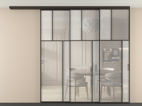 Во всех алюминиевых перегородках, независимо от типа установки, используется компланарный раздвижной механизм, благодаря которому декоративная крышка и полотно находятся в одной плоскости.