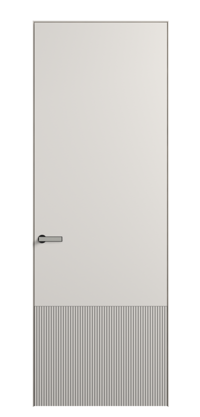 Это полотна с рельефной фрезеровкой. Этот прием делает интерьер объемным, тактильным, вносит интересную текстуру и создает современный образ. Волнистый рельеф может быть выполнен по ламелям из массива дуба в древесных матовых отделках, либо исполнен по натуральному и экологически безопасному материалу — ХДФ, покрытому гладкой эмалью актуальных оттенков.