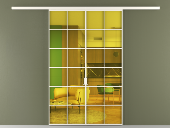 Дополнительно на раздвижную двустворчатую перегородку вдоль стены и четырёхстворчатую перегородку внутри проёма с двумя неподвижным полотнами можно установить механизм синхронного открывания — при открывании одной створки, вторая открывается автоматически.