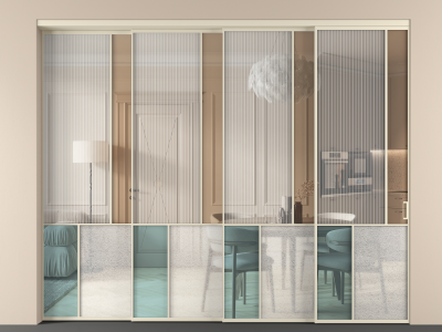 Во всех алюминиевых перегородках, независимо от типа установки, используется компланарный раздвижной механизм, благодаря которому декоративная крышка и полотно находятся в одной плоскости.
